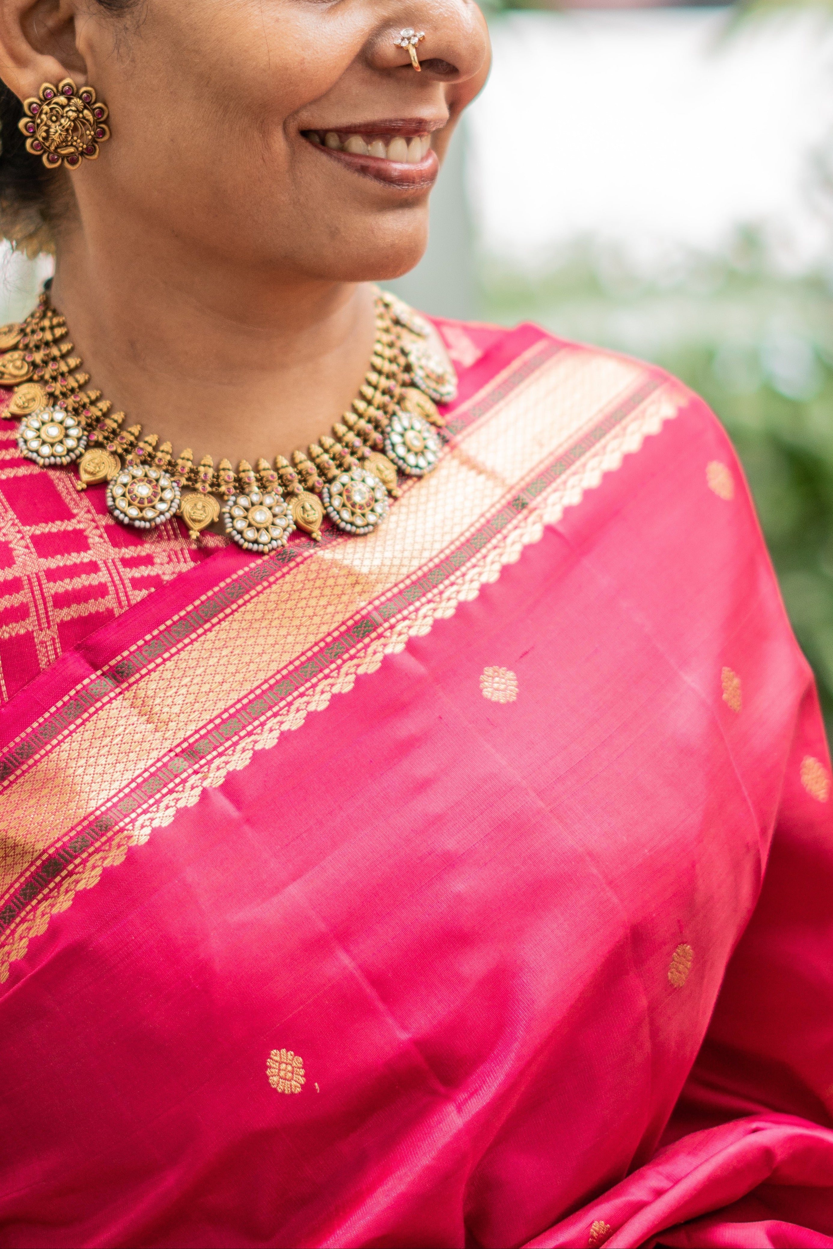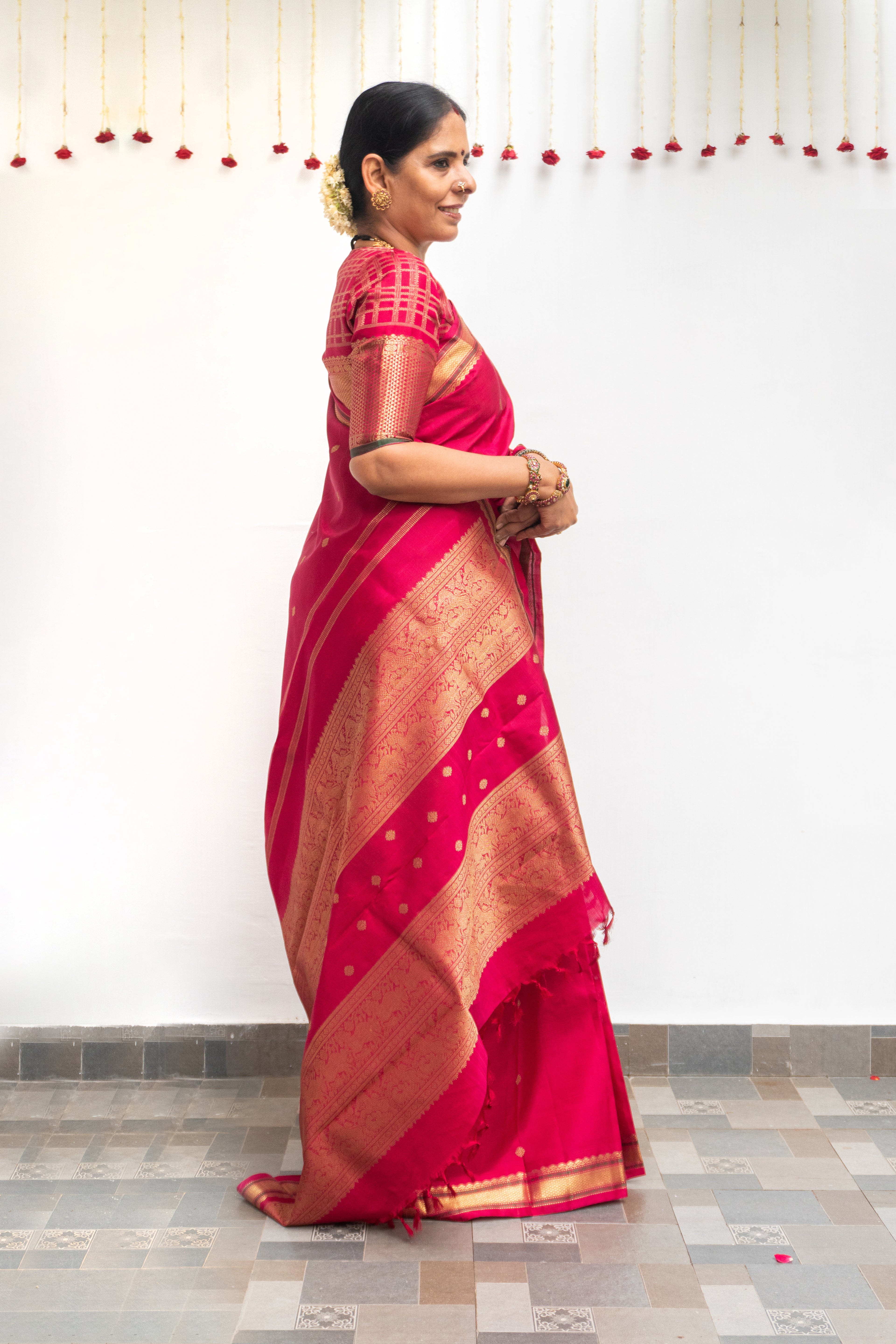 The blouse styled with each saree is from our exclusive in-house collection and may differ from the blouse piece provided with the saree.