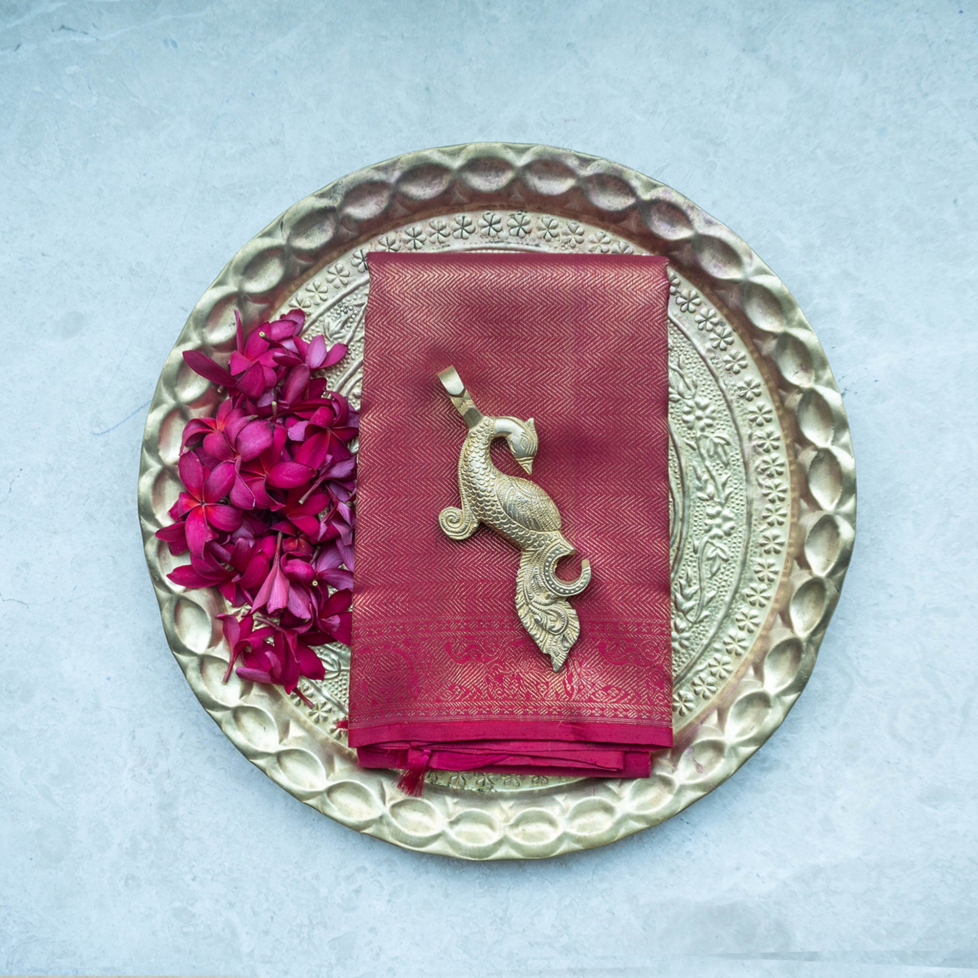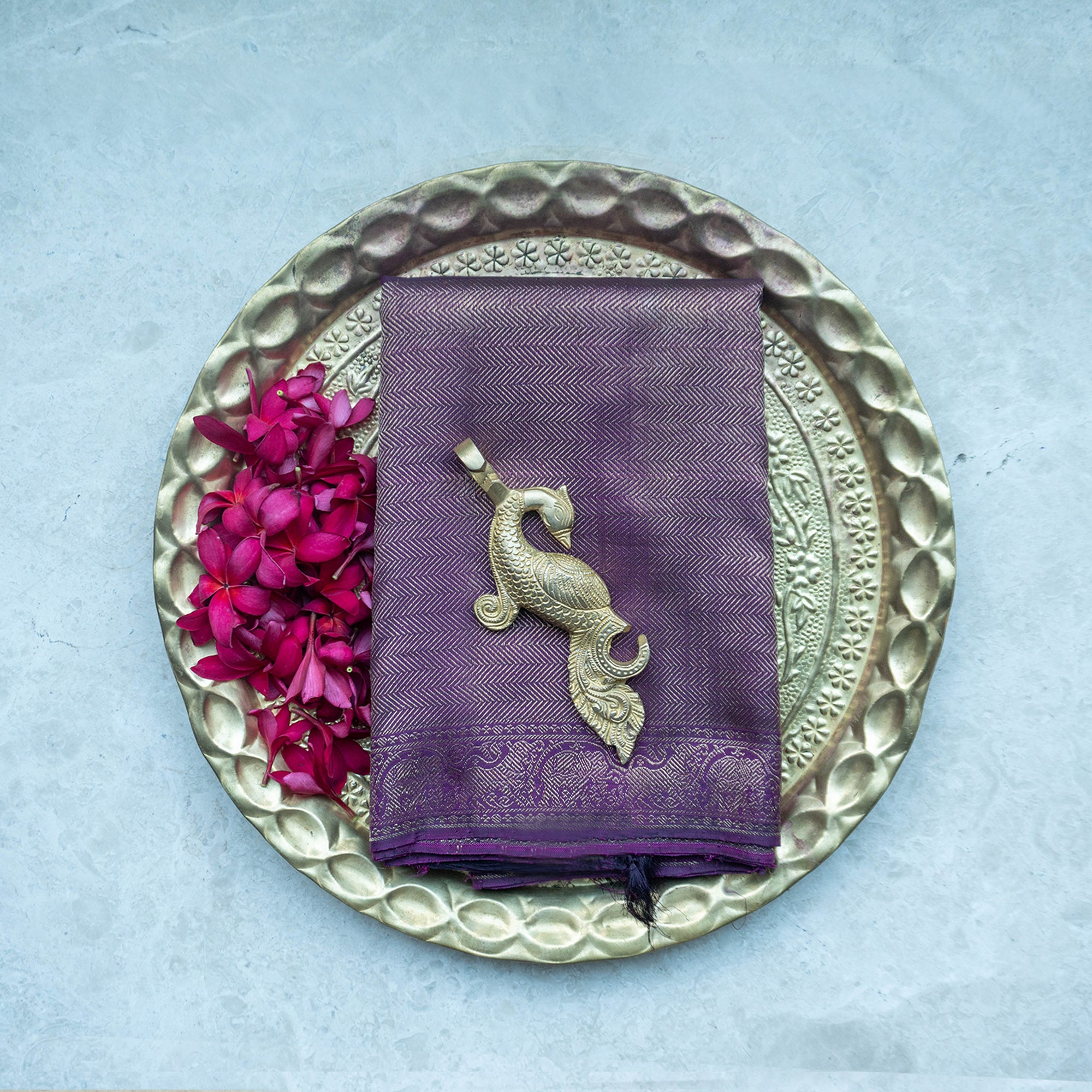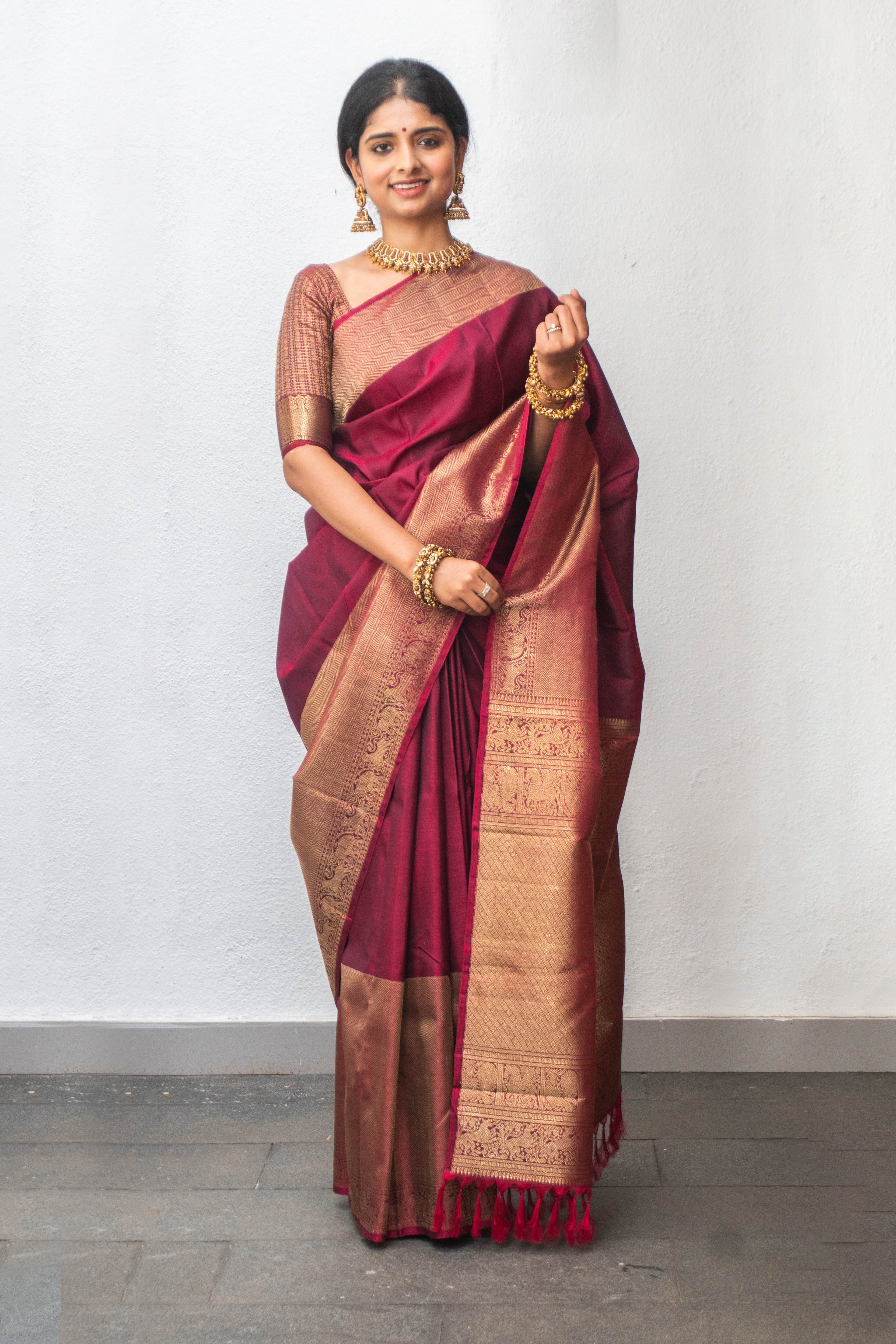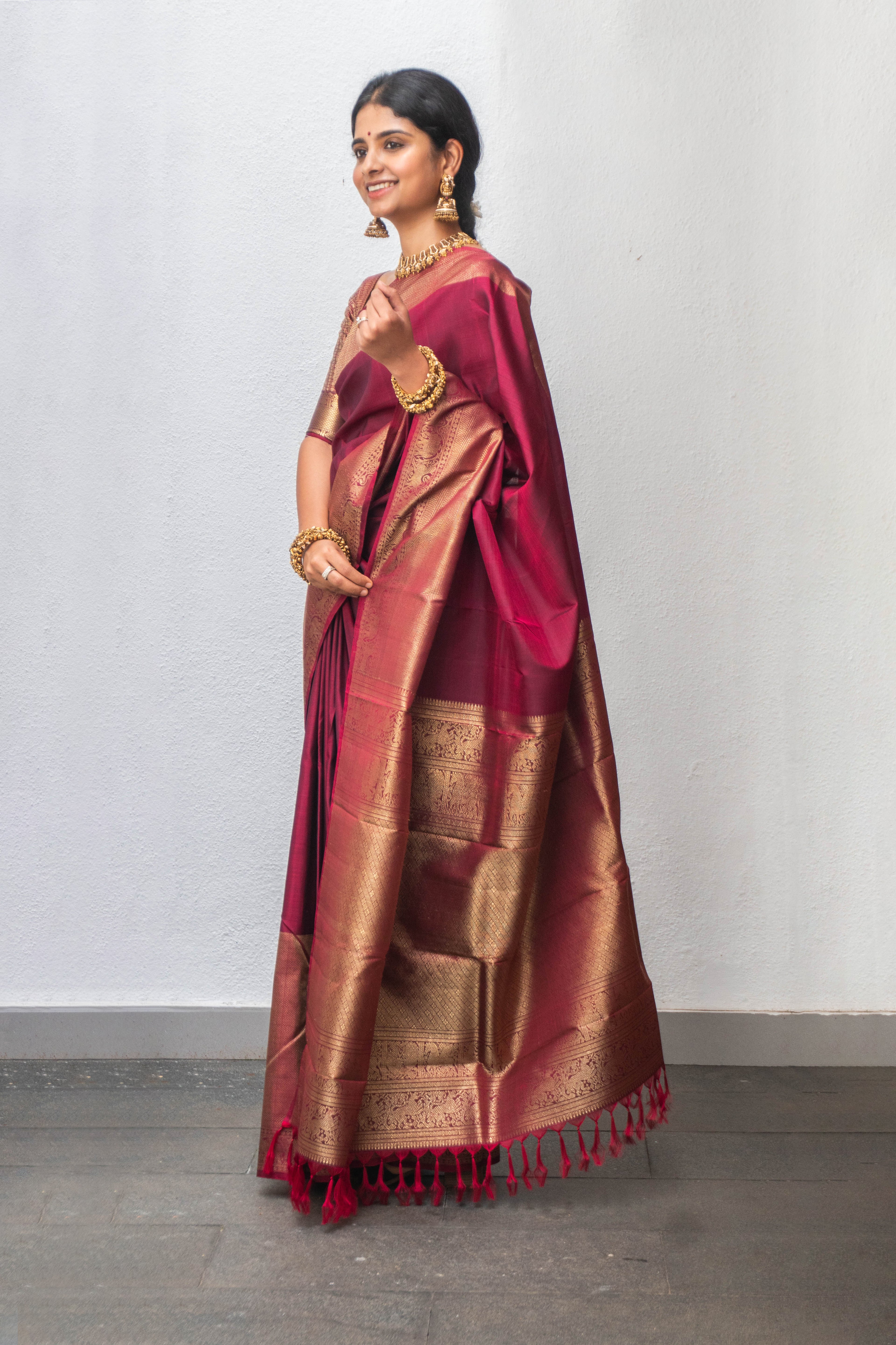 Regal wine Kanjivaram silk saree with lustrous border on either sides with animal figurines and geometric patterns. The rich colour lends an effortless elegance to any occasions. The blouse has dots woven in pure gold zari.