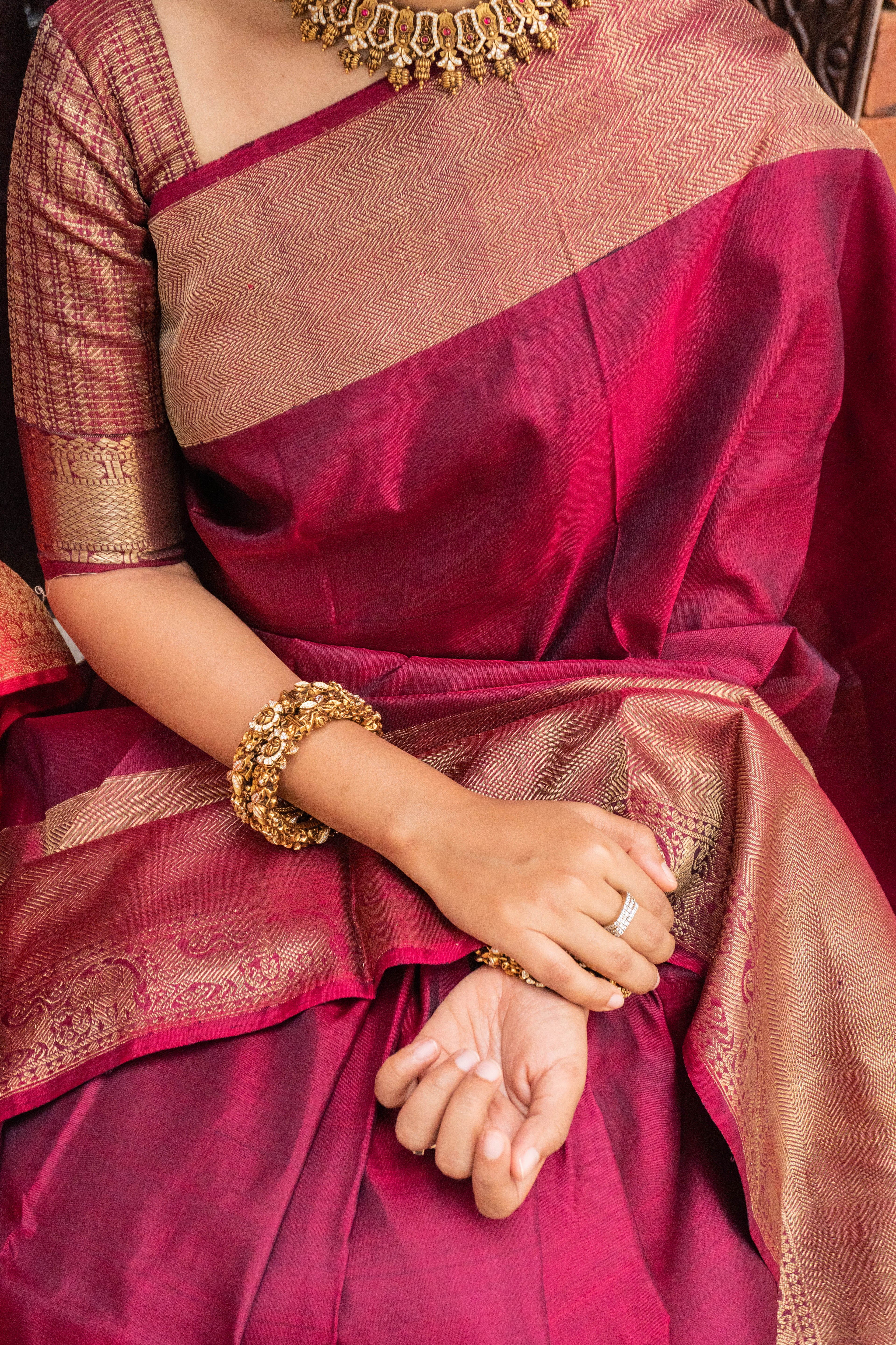 The blouse styled with each saree is from our exclusive in-house collection and may differ from the blouse piece provided with the saree.