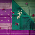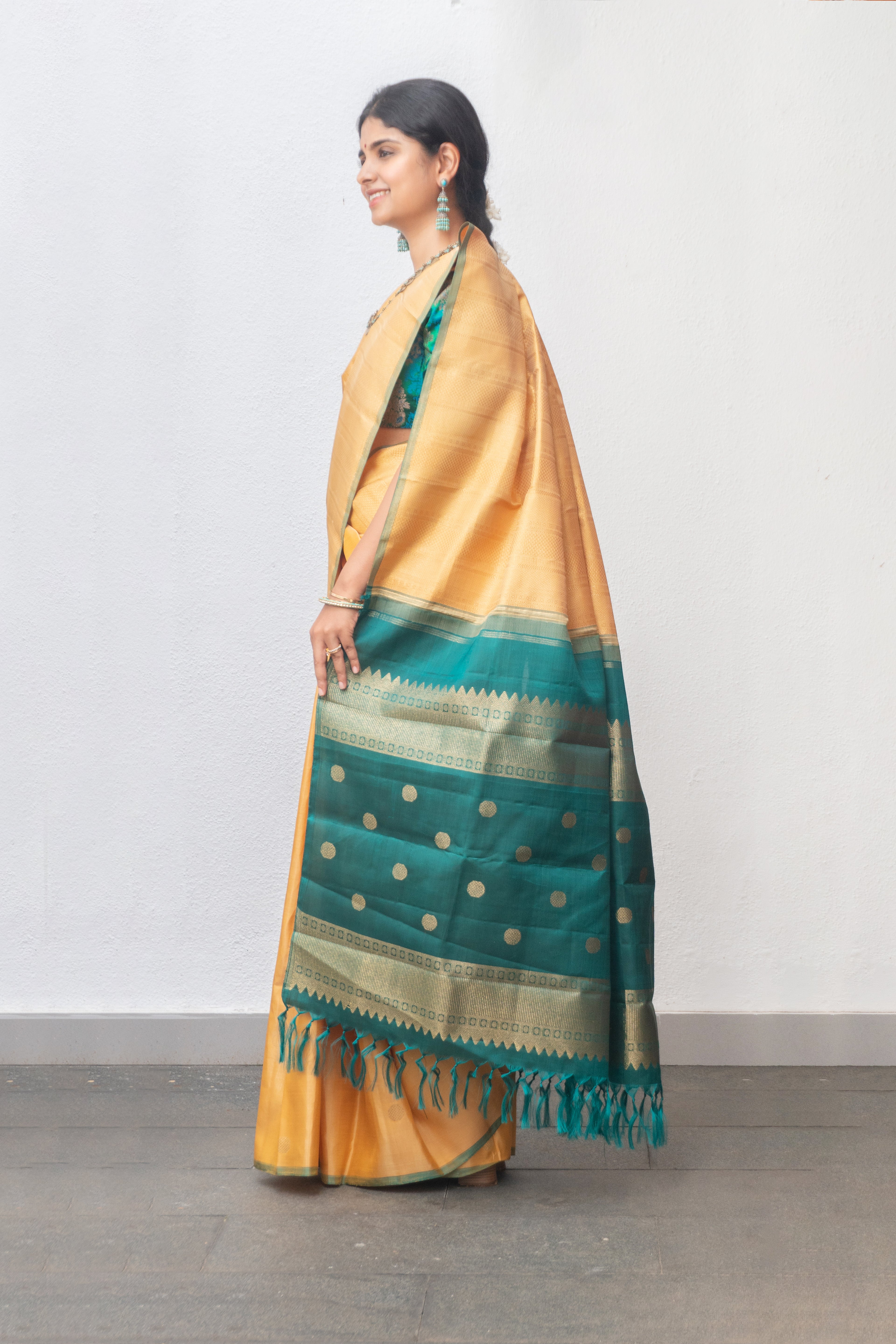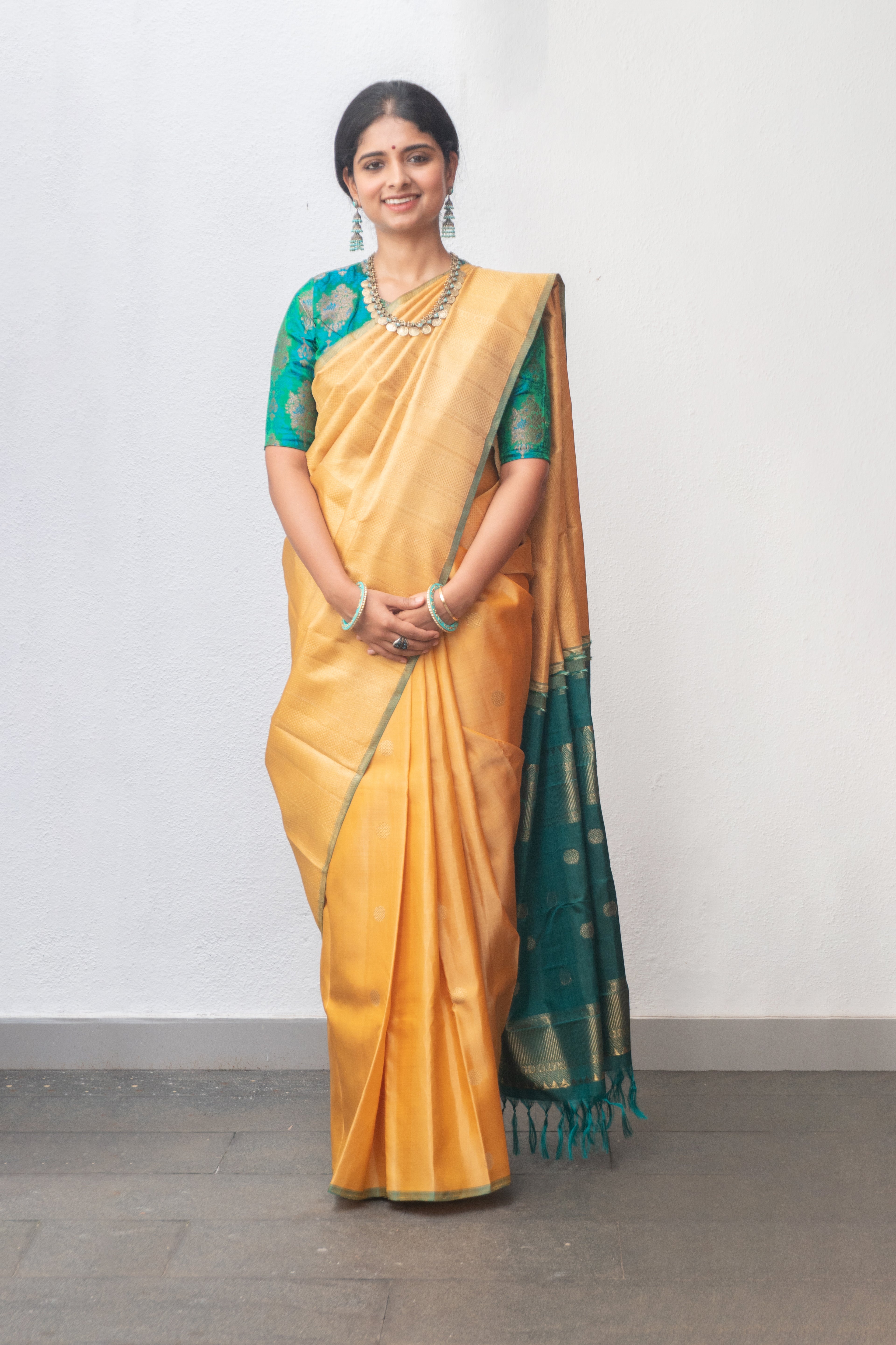 Exquisite dual tone kanjivaram silk saree, crafted to perfection with a luxurious shoulder rich design. The standout feature lies in the intricately woven shoulder area, which boasts opulent zari work. The pallu and blouse is a contrast with traditional motifs and fine craftsmanship that define the heritage of Kanjivaram weaving.