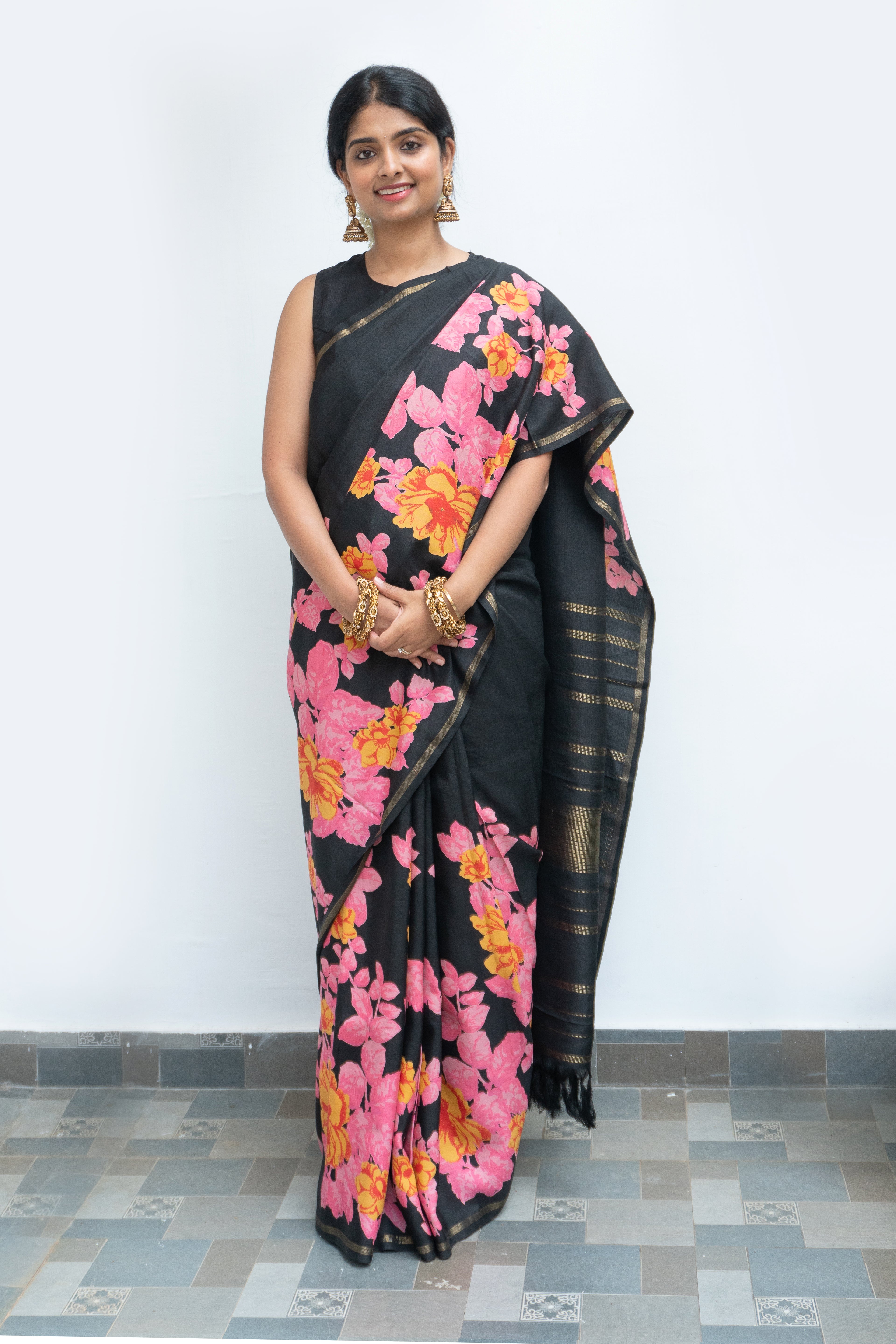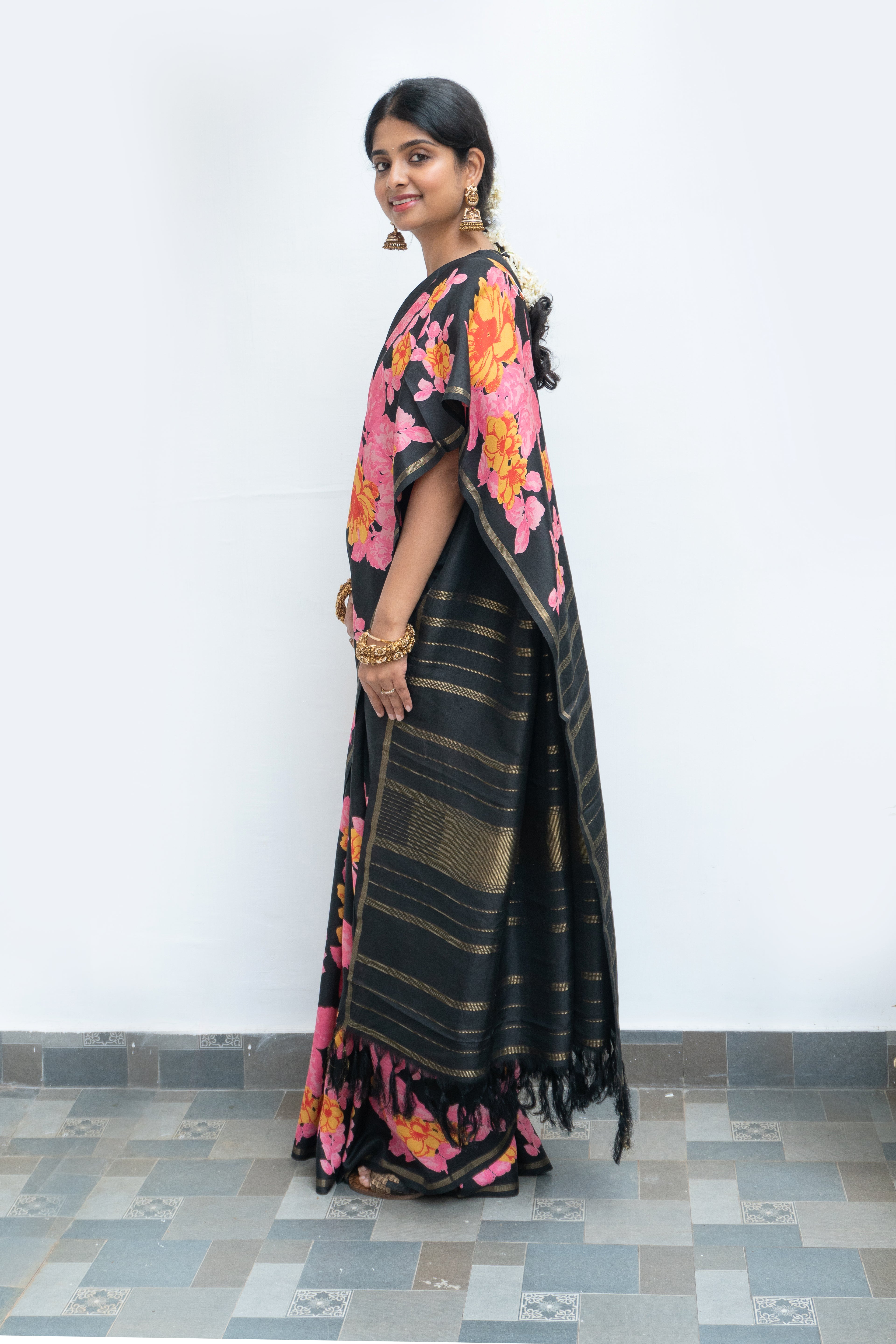 Striking and sophisticated, this black kanjivaram silk saree is adorned with vibrant floral motifs, that stand out beautifully against the deep, lustrous silk base. The saree has a “seer” pallu woven in pure gold zari.