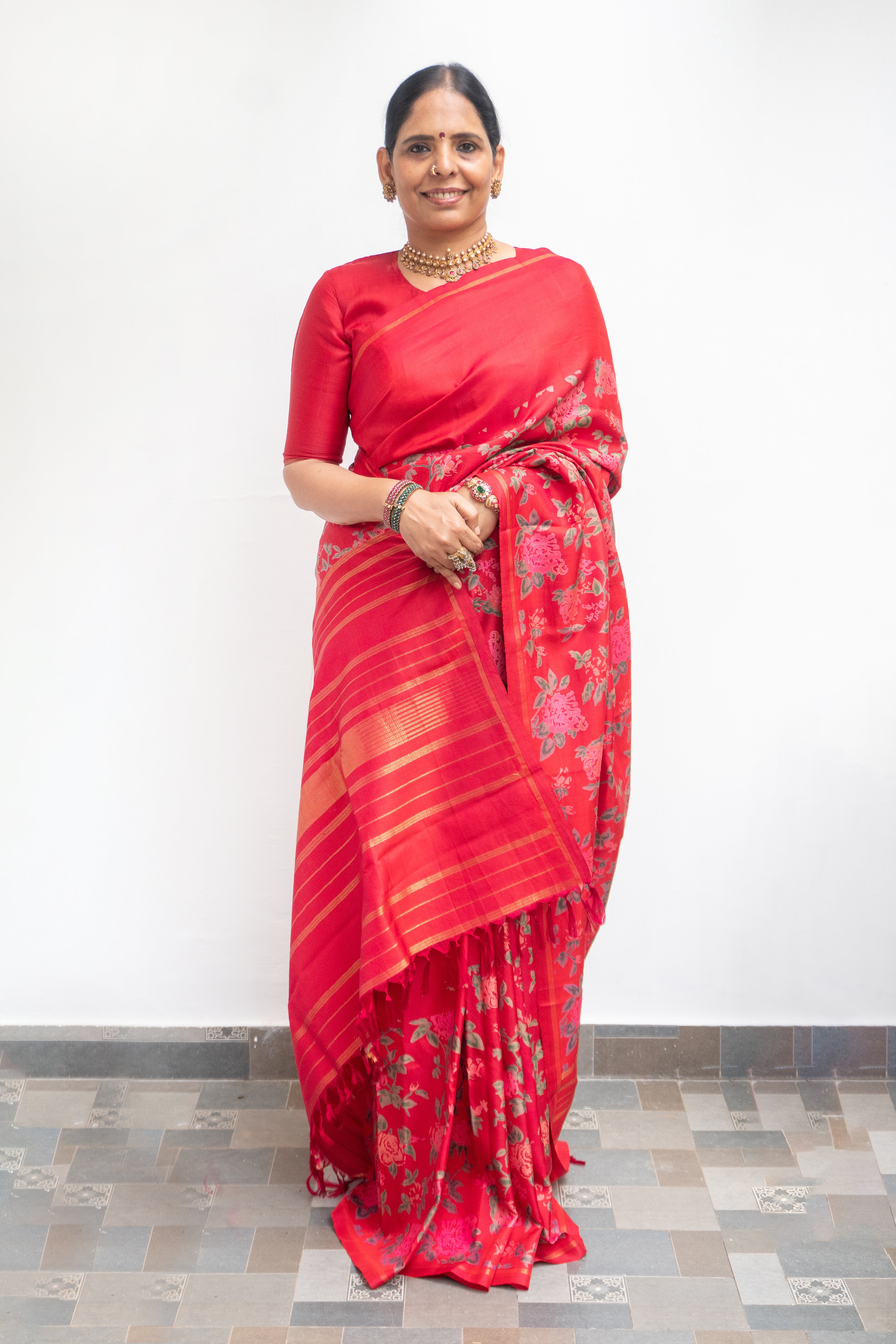 Red timeless Kanjivaram classic which has been reimagined with a modern touch. Woven with rich luxurious silk, the saree retains the luxurious texture of kanjivaram craftsmanship, while the soft floral motifs add a refreshing flair.