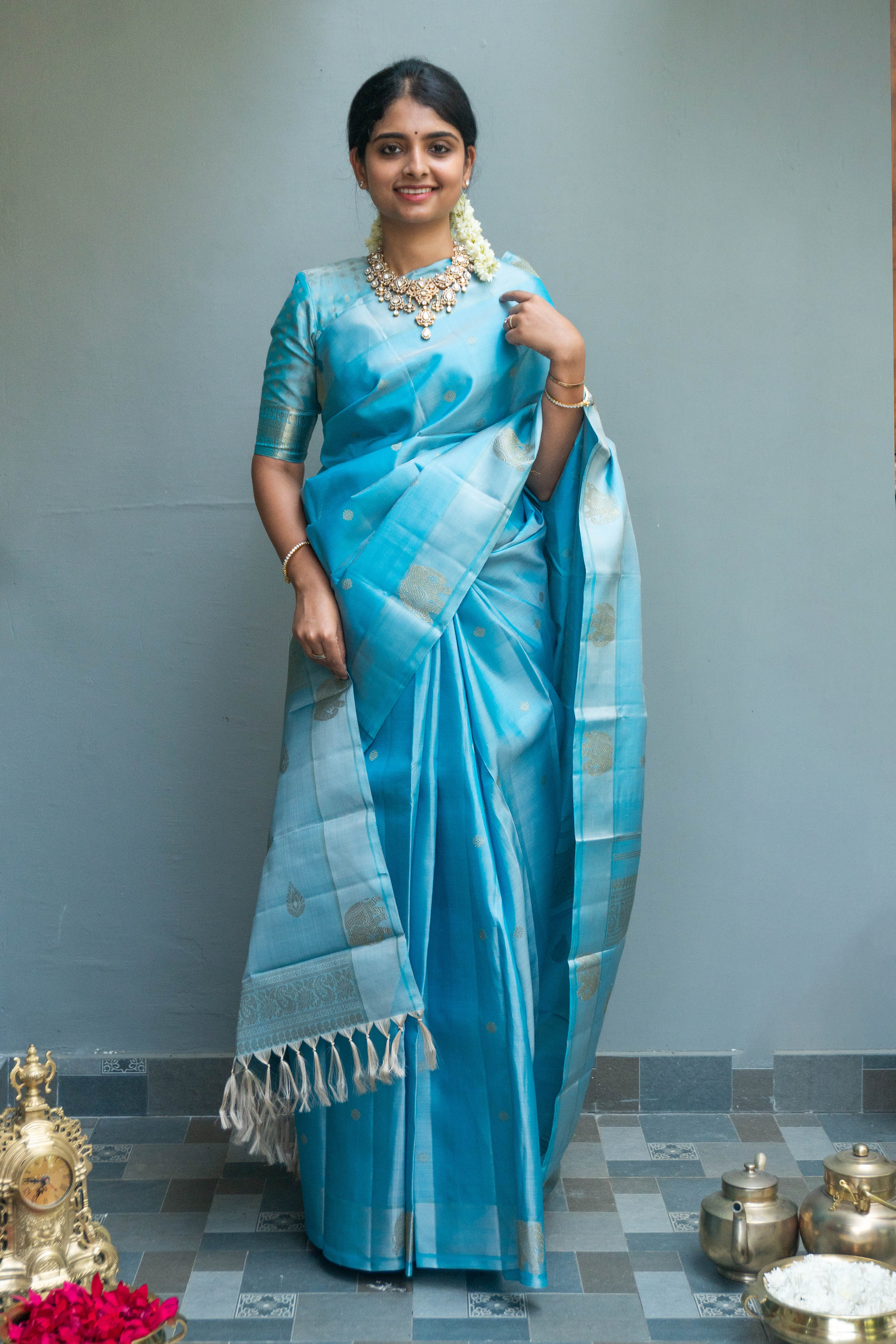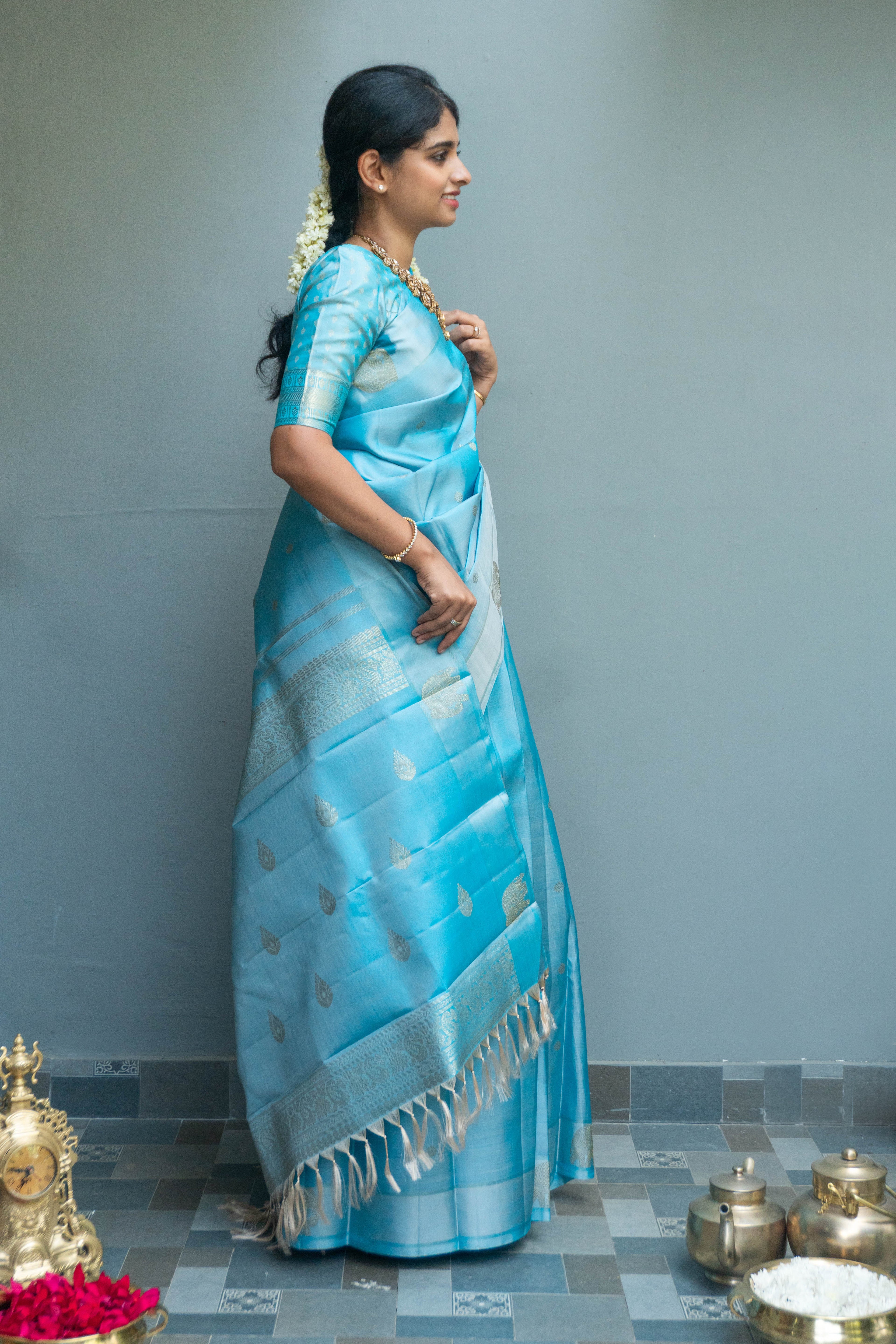A pure Kanjivaram silk saree in powder blue. Handwoven with the purest threads, the body has buttis in the body. The border is unique with elephants placed equidistant. The pallu has borders which form the sides of the pallu and the center has individual floral golden Zari motifs.