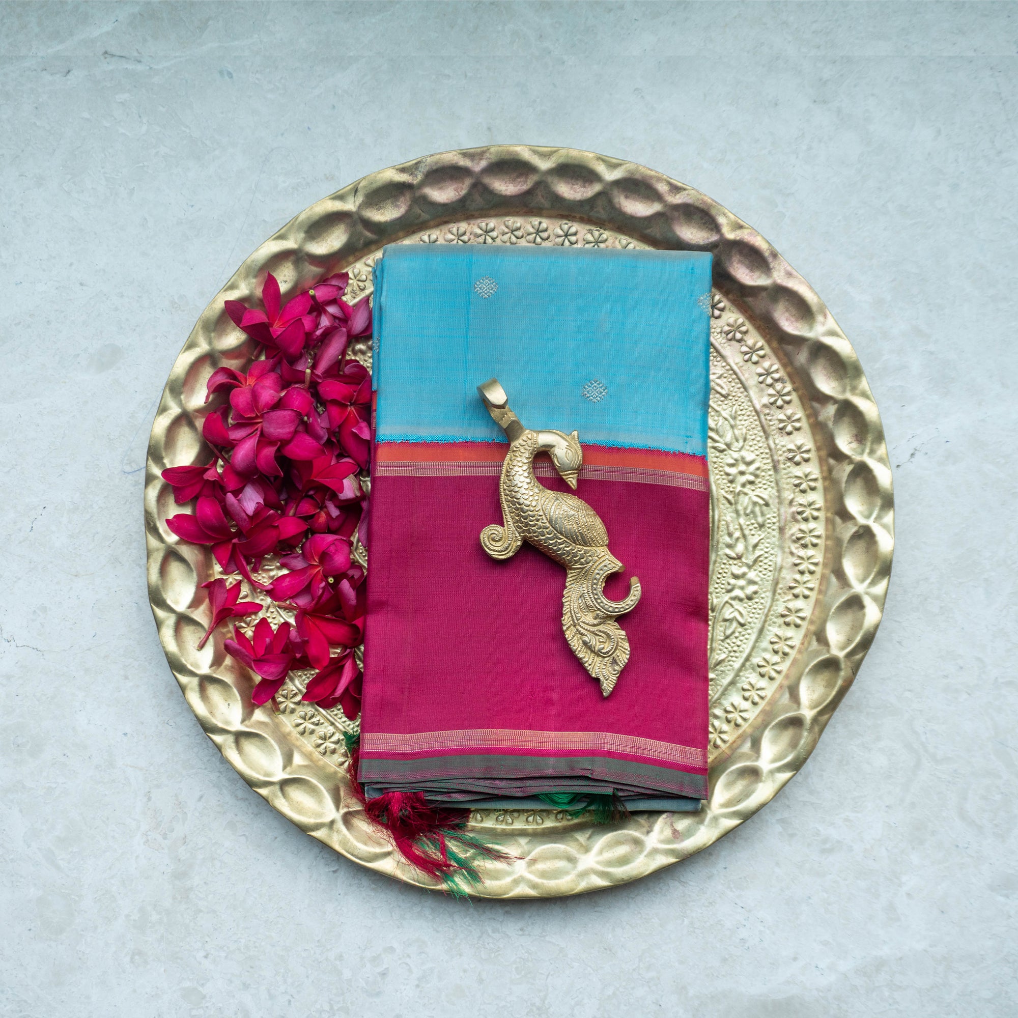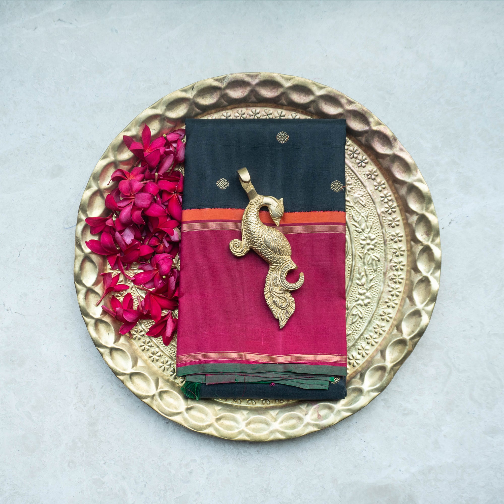 Yellow Kanjivaram silk saree with traditional buttis in the body. The saree is contrasted by a korvai arakku border with bands of gold zari on either sides. The saree has a green selvedge.