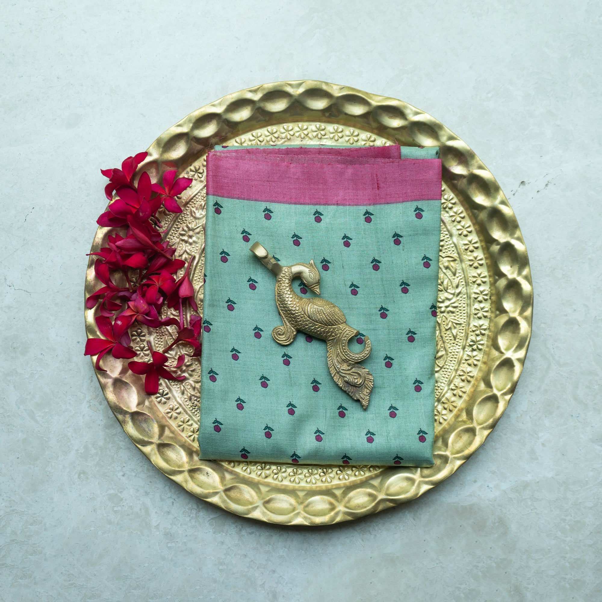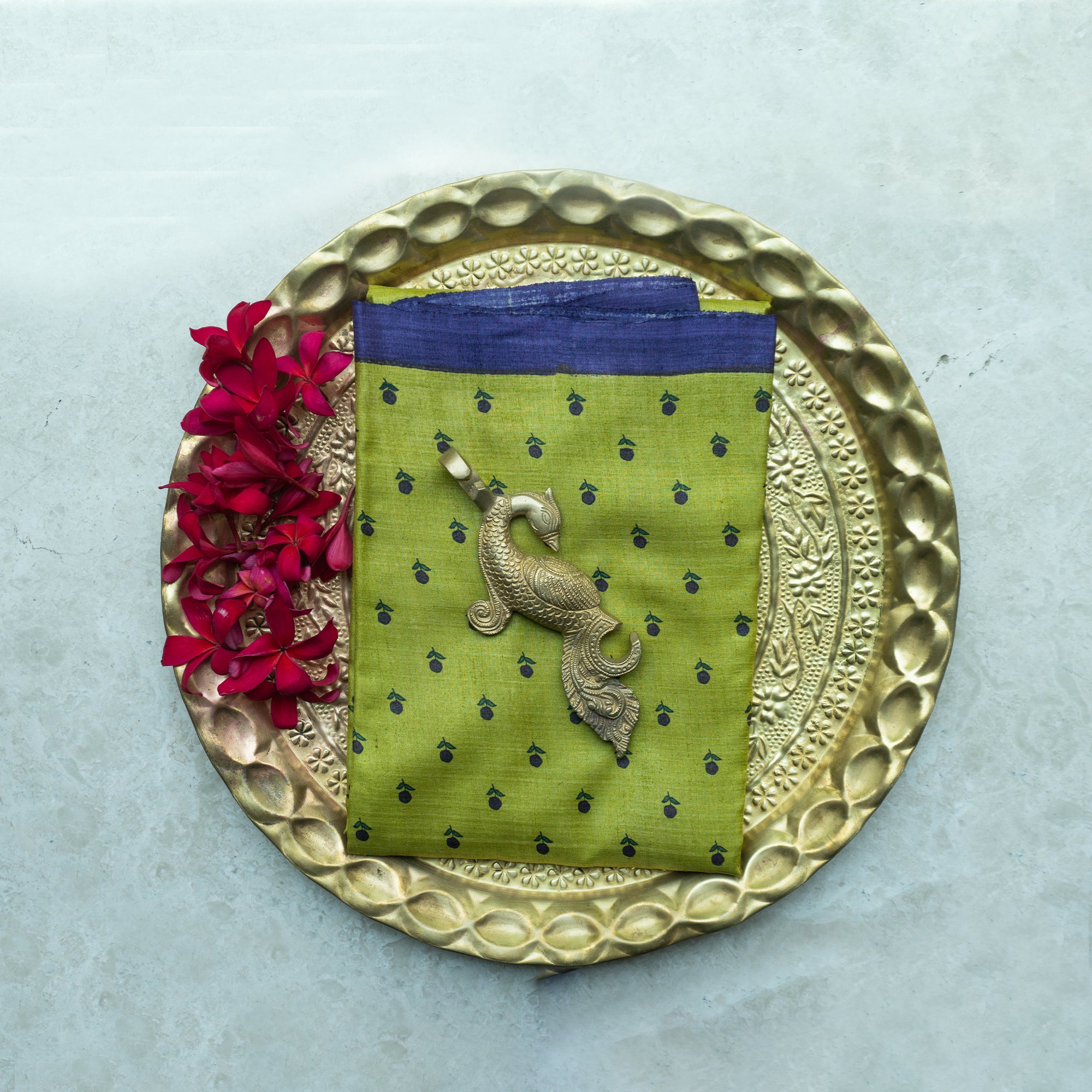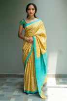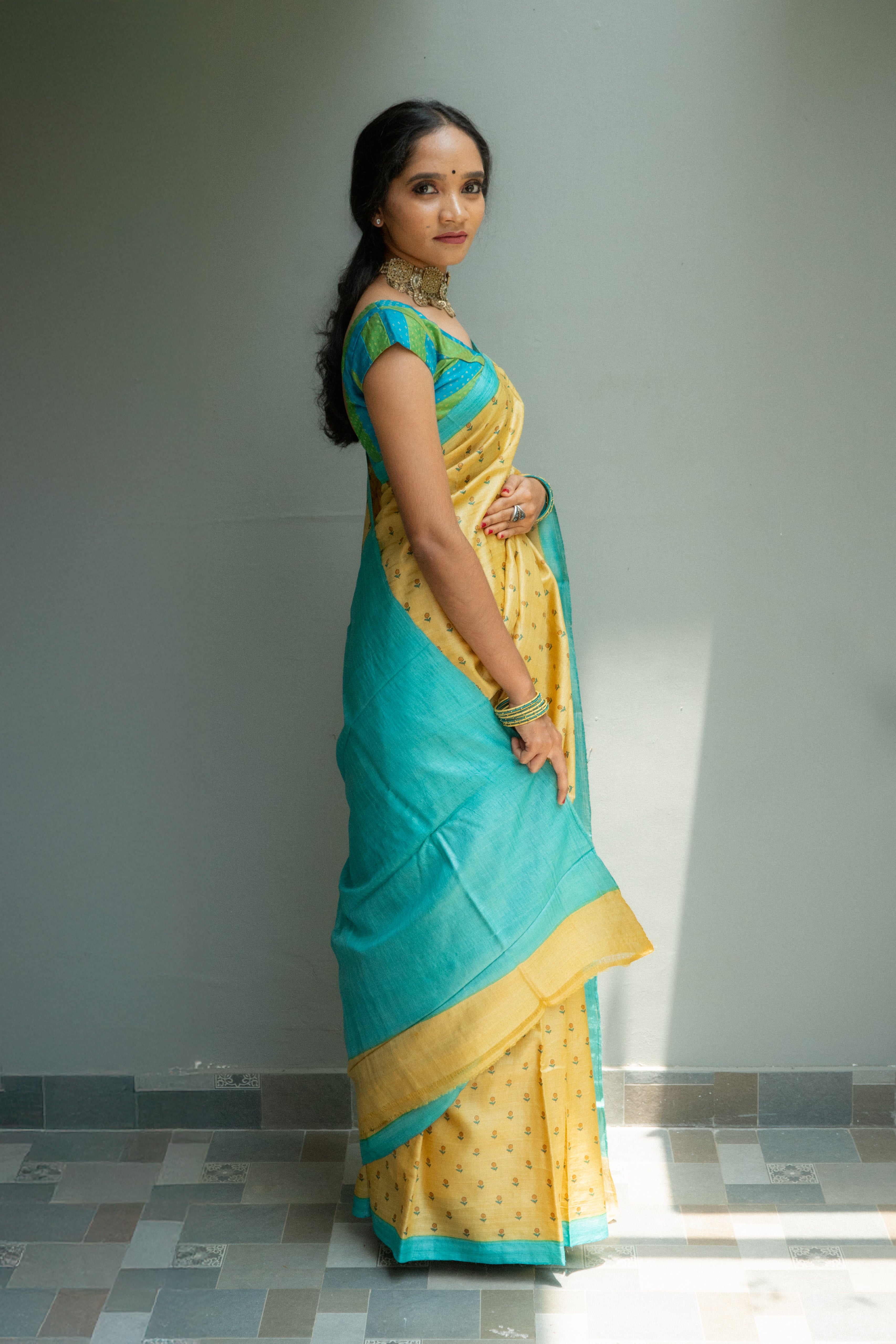 Yellow Tussar silk saree with our signature hand block printed motifs in the body, which flows into a contrast turquoise blue pallu, border, and blouse.